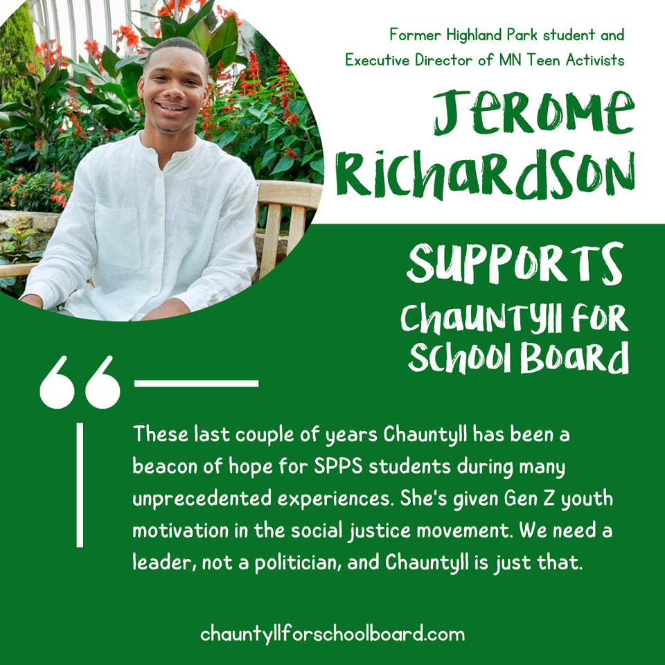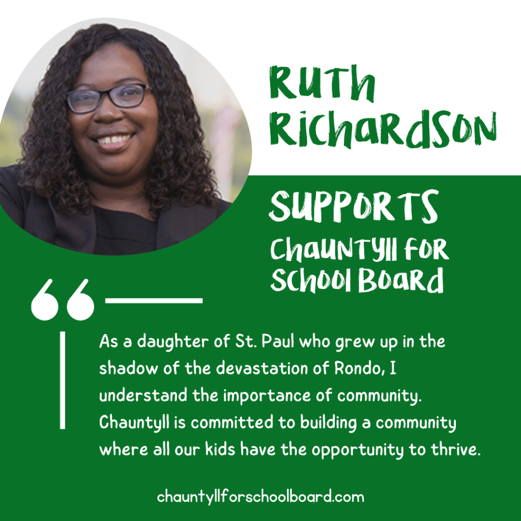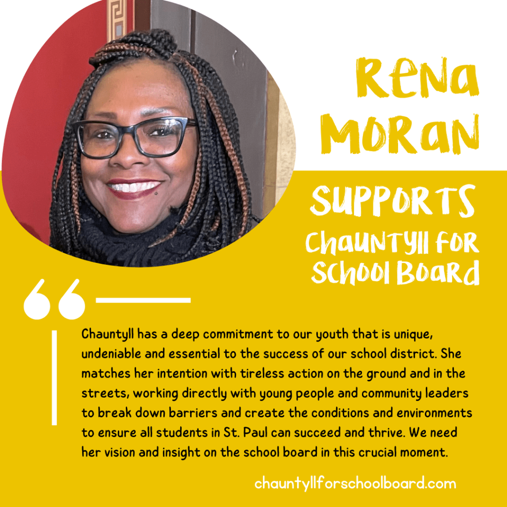 In her many years of grassroots organizing and public service, Chauntyll has always taken a village approach to advancing change. She knows that none of us can individually create the movements we need to achieve liberation and justice for our communities. That’s why she has strong support of many community leaders (of all ages!), elected officials and organizations who continue to collaborate with her to build a school to success pipeline for ALL St. Paul youth!